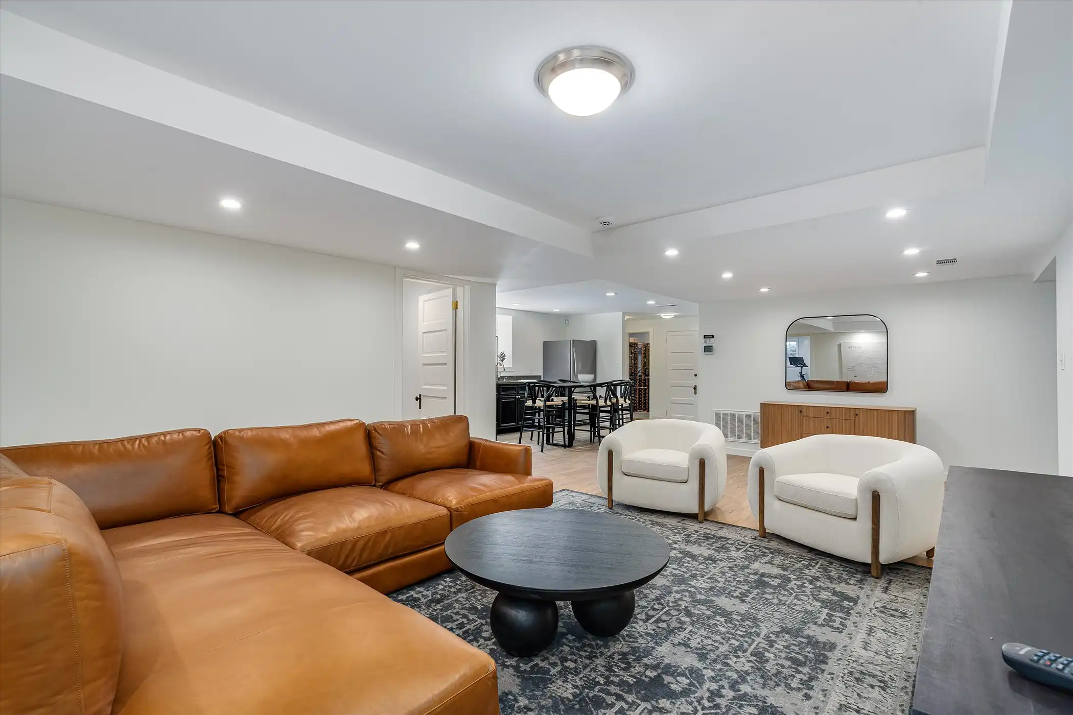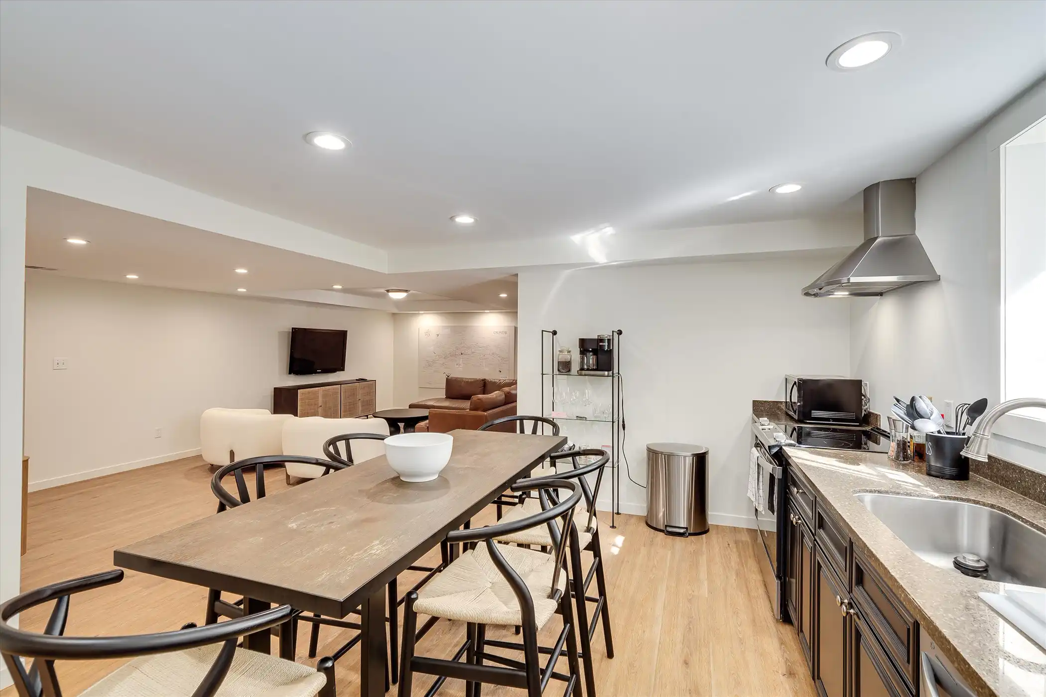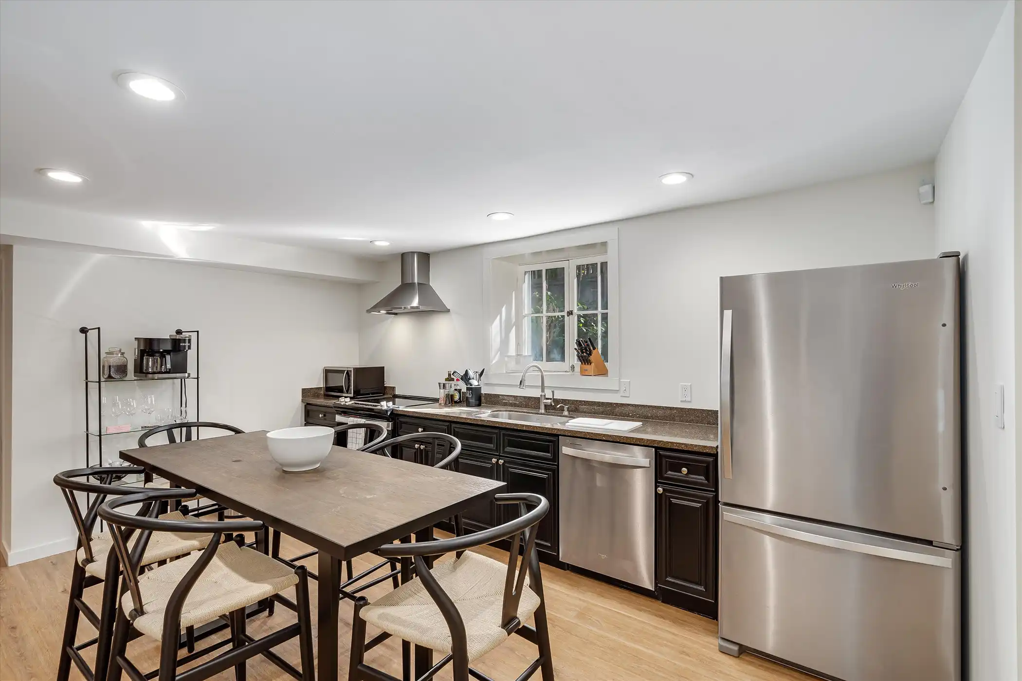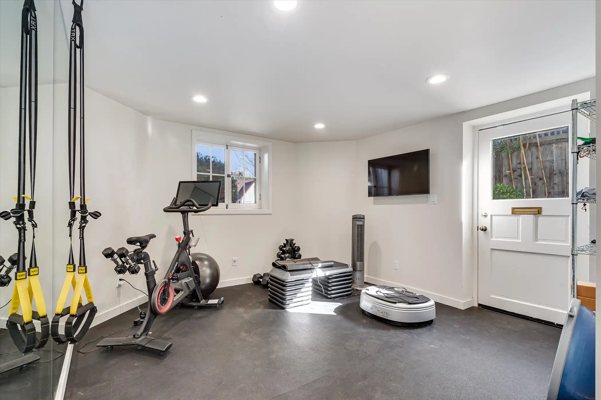 The ground level boasts a private guest apartment with 2 queen bedrooms, 1 bathroom and its own living room with 50´TV, dining area, contemporary kitchen, and washer and dryer—ideal for extended family, guests, or added privacy. This also has a well-equipped fitness room with a Peloton bike, free weights, and additional exercise equipment.