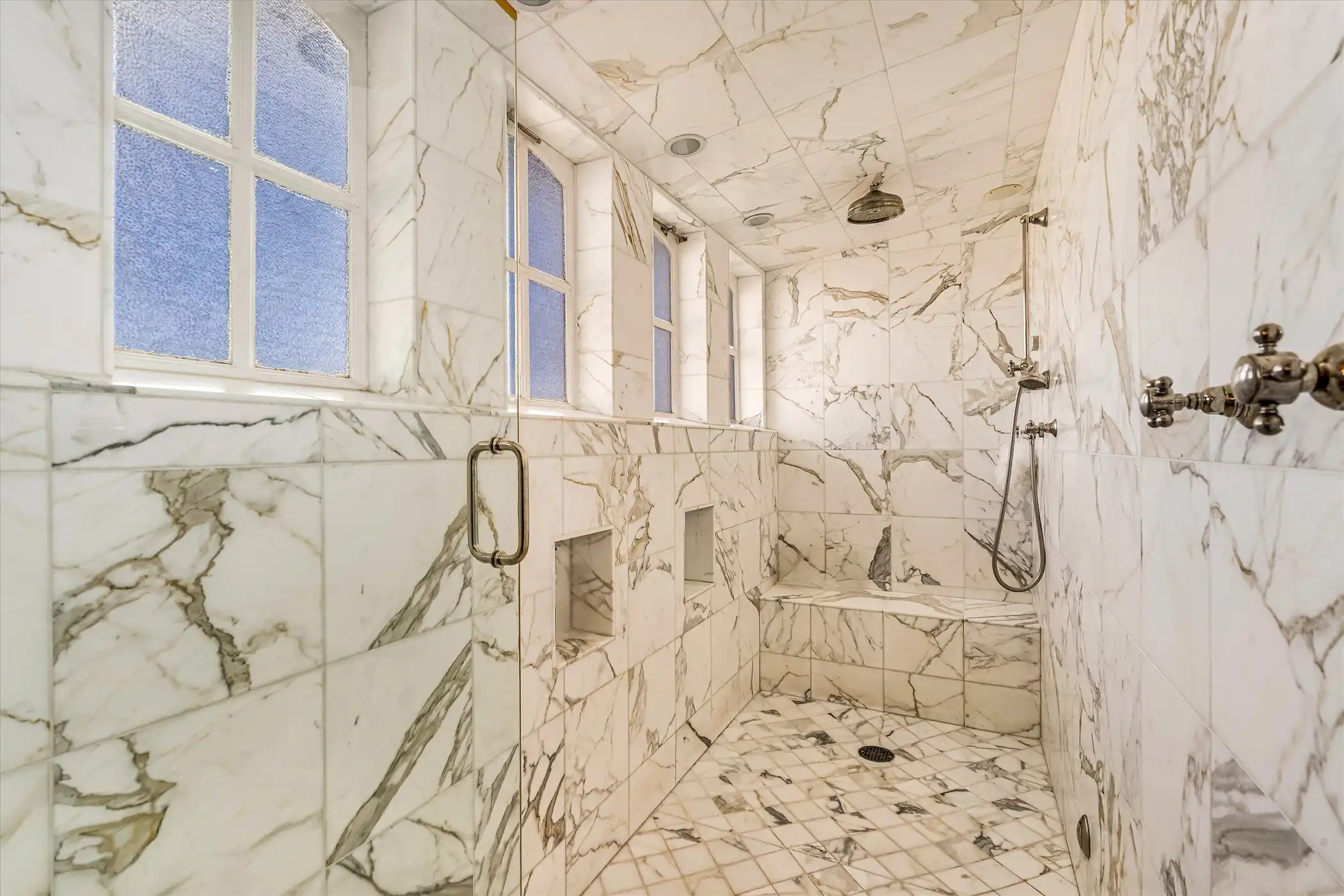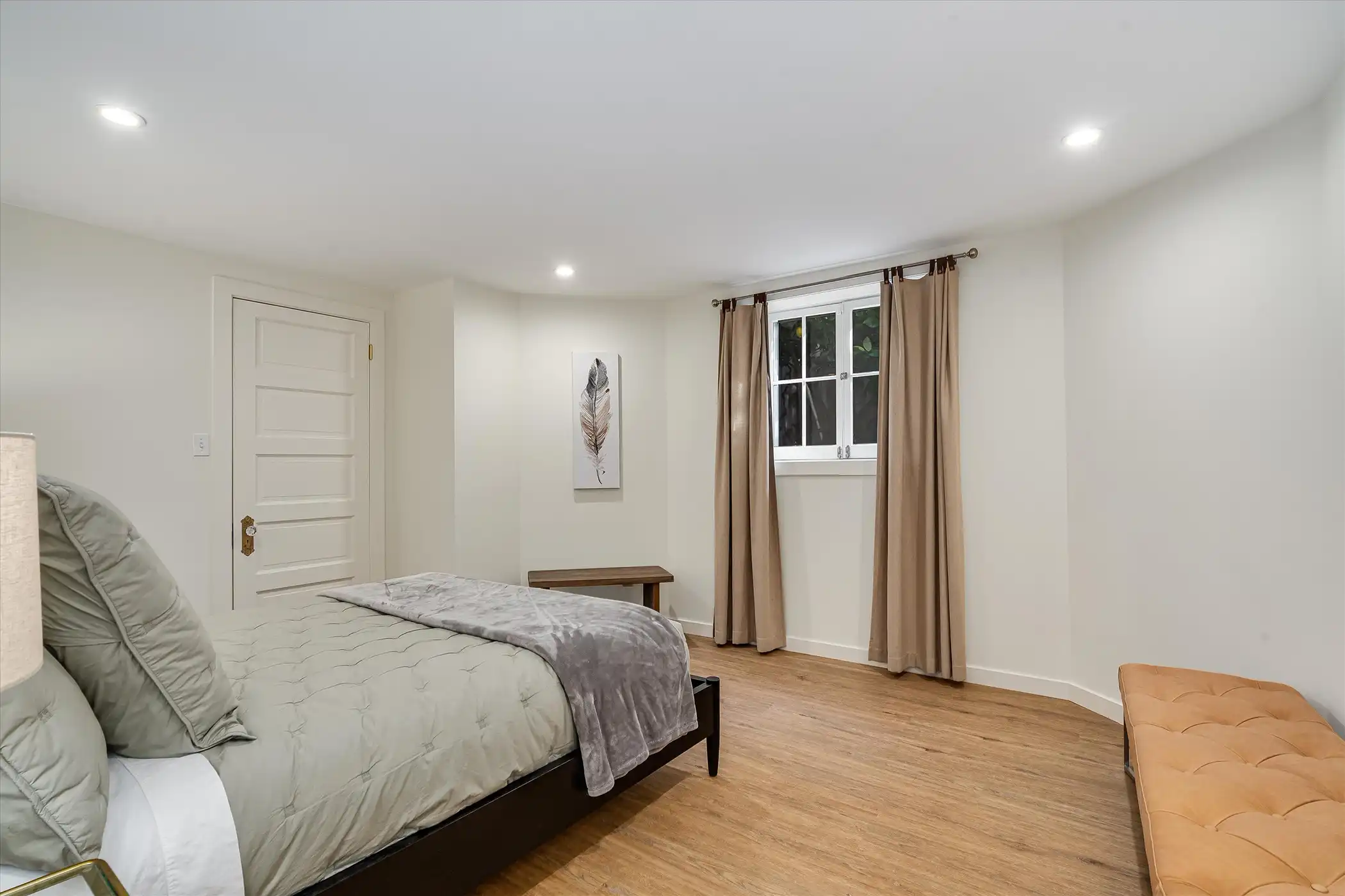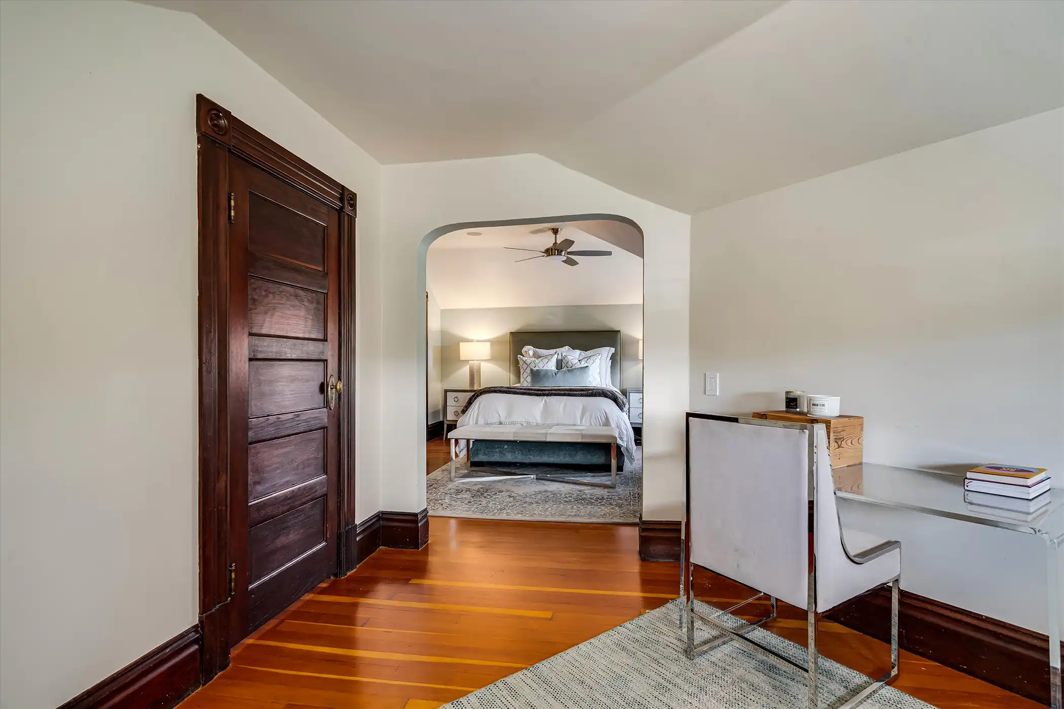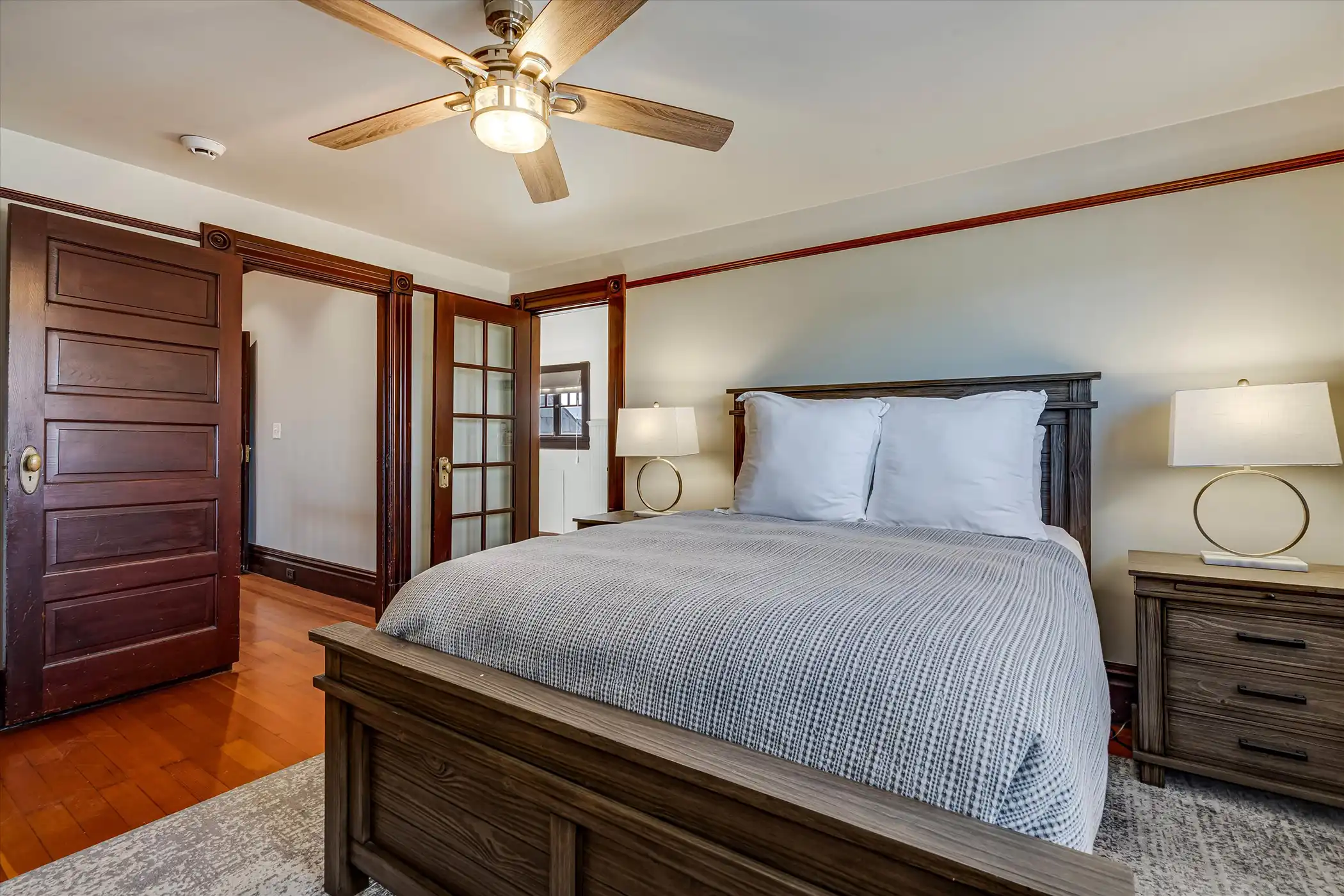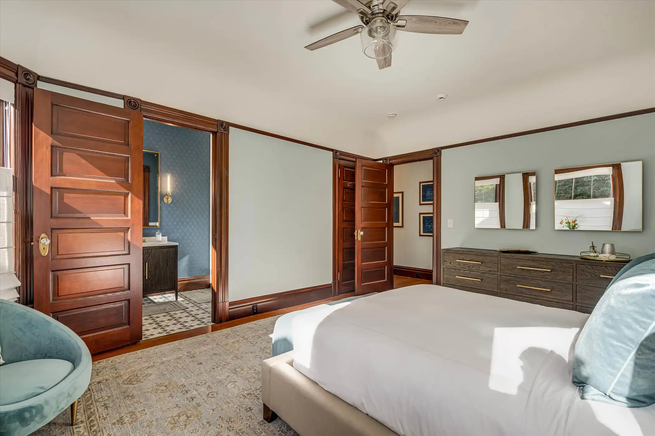The original restored staircase leads to the upper floor, where the expansive ensuite primary queen bed suite offers a private retreat with an office area, comfortable seating space with a 50” TV, and a separate sitting room with a wet bar. The oversized primary bathroom is distinguished by marble tile floors, a deep soaking tub, and generous closet space. This floor also includes an additional ensuite queen bedroom overlooking the backyard, as well as a washer and dryer.