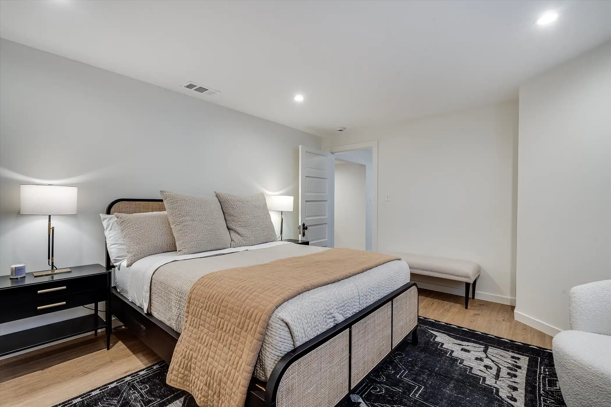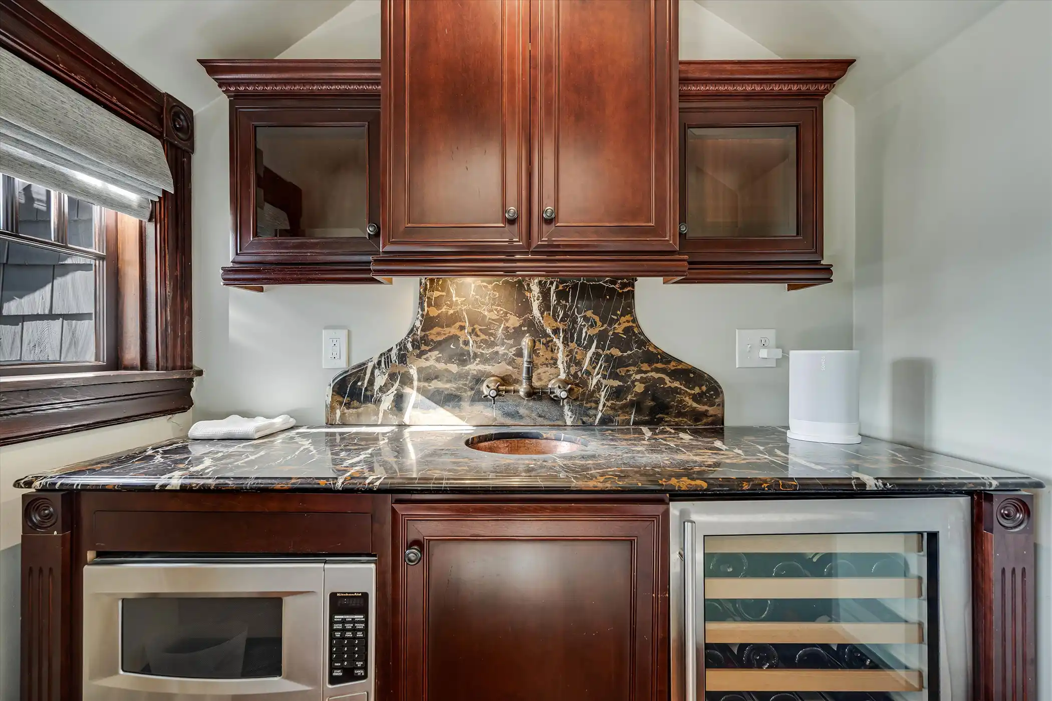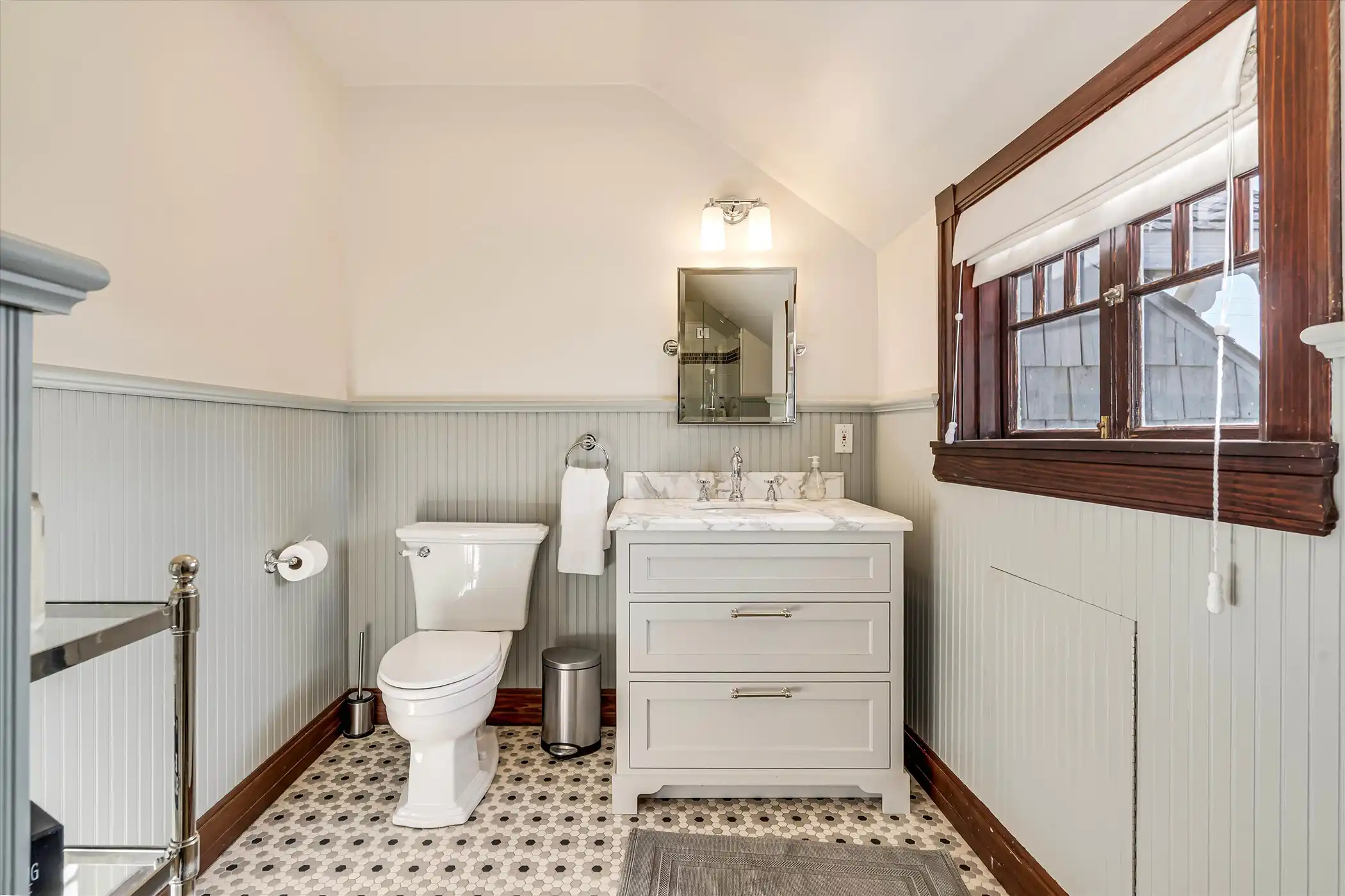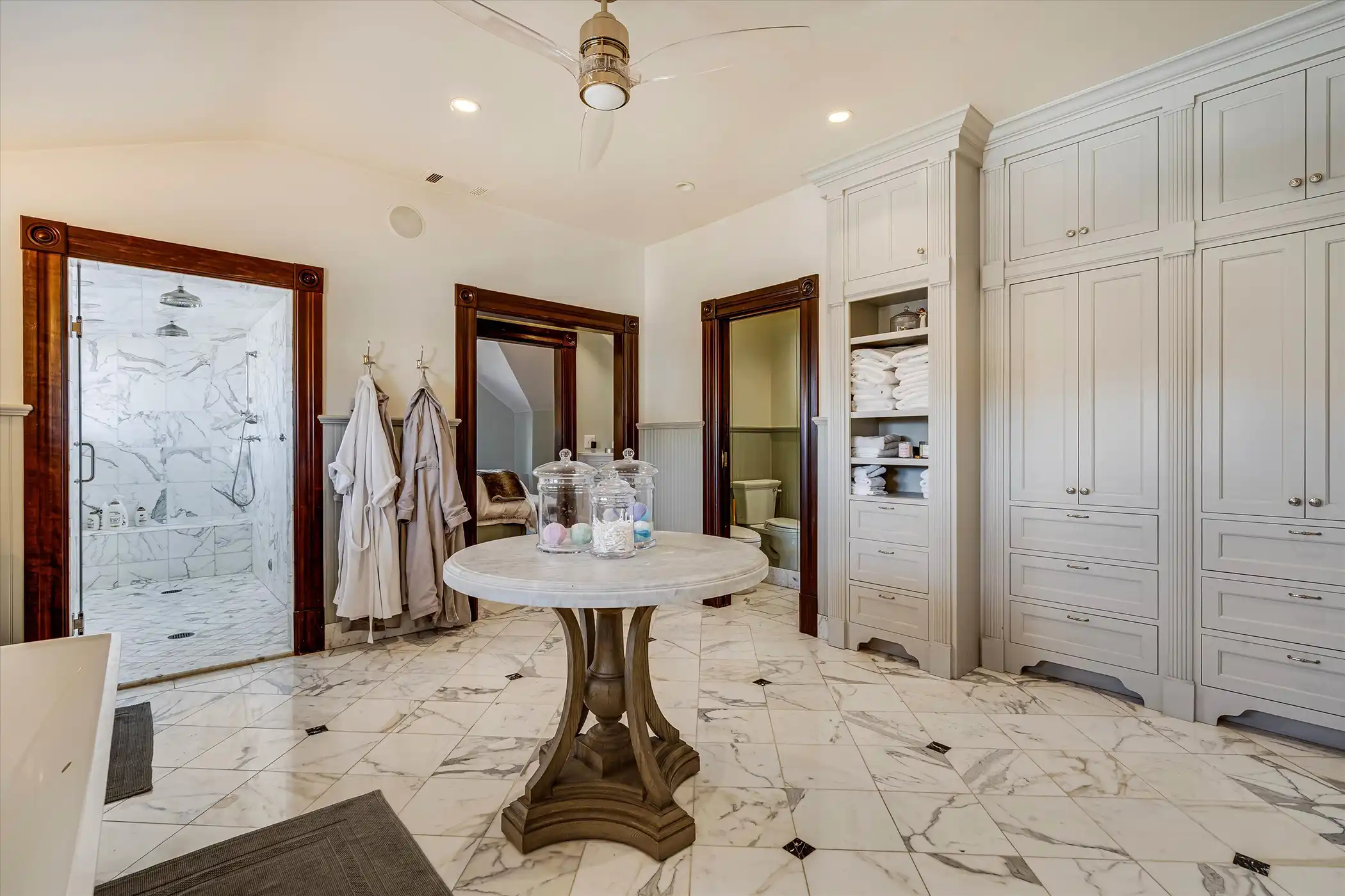 The original restored staircase leads to the upper floor, where the expansive ensuite primary queen bed suite offers a private retreat with an office area, comfortable seating space with a 50” TV, and a separate sitting room with a wet bar. The oversized primary bathroom is distinguished by marble tile floors, a deep soaking tub, and generous closet space. This floor also includes an additional ensuite queen bedroom overlooking the backyard, as well as a washer and dryer.