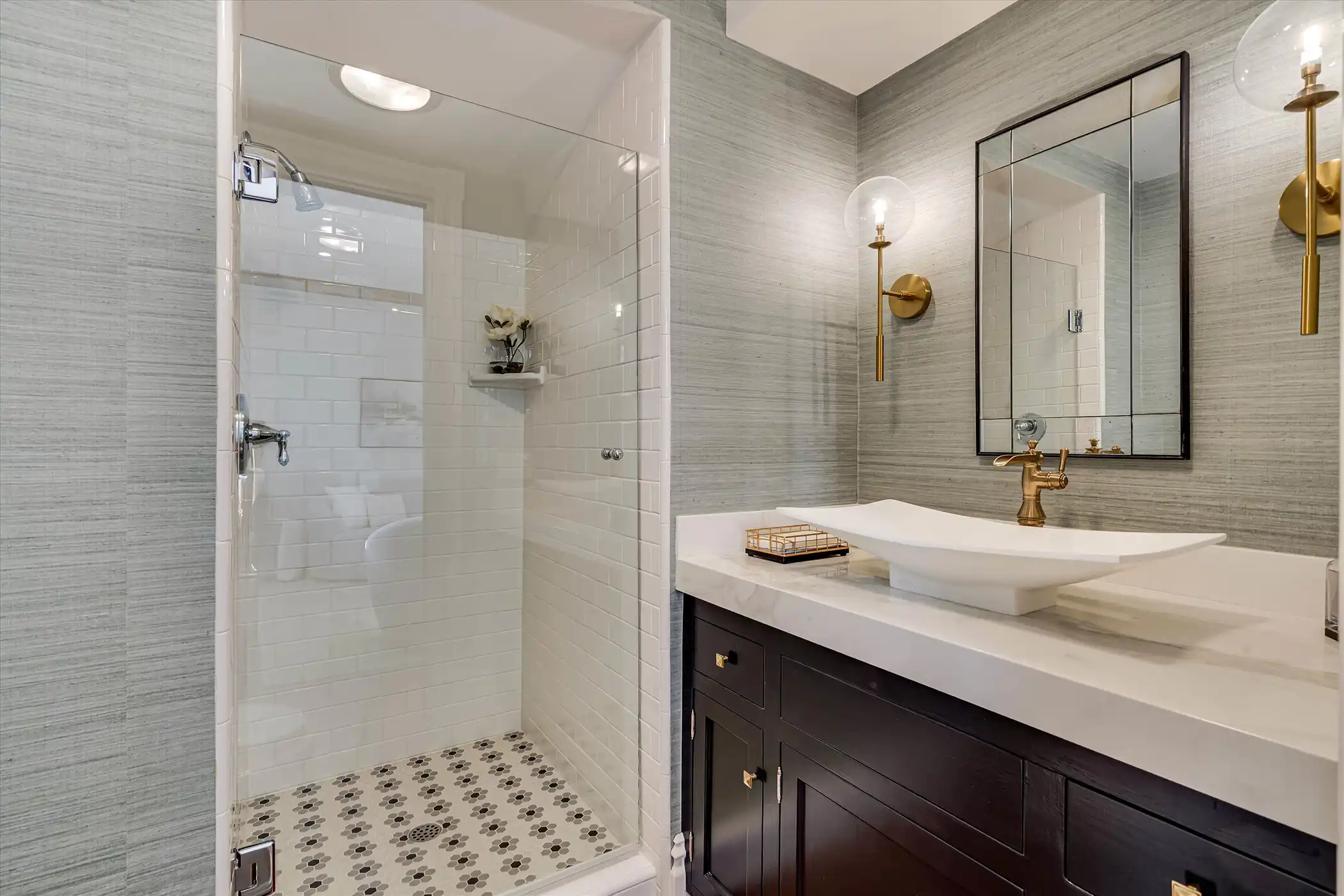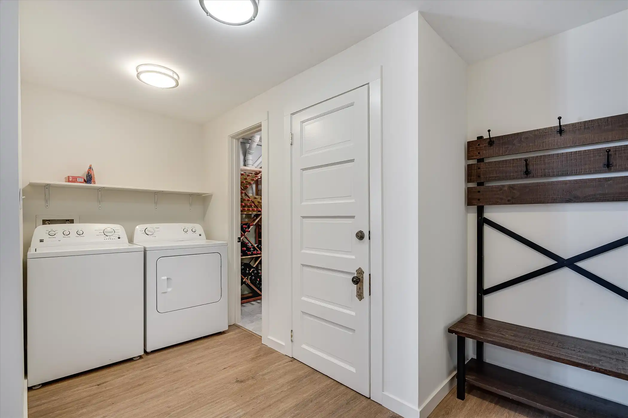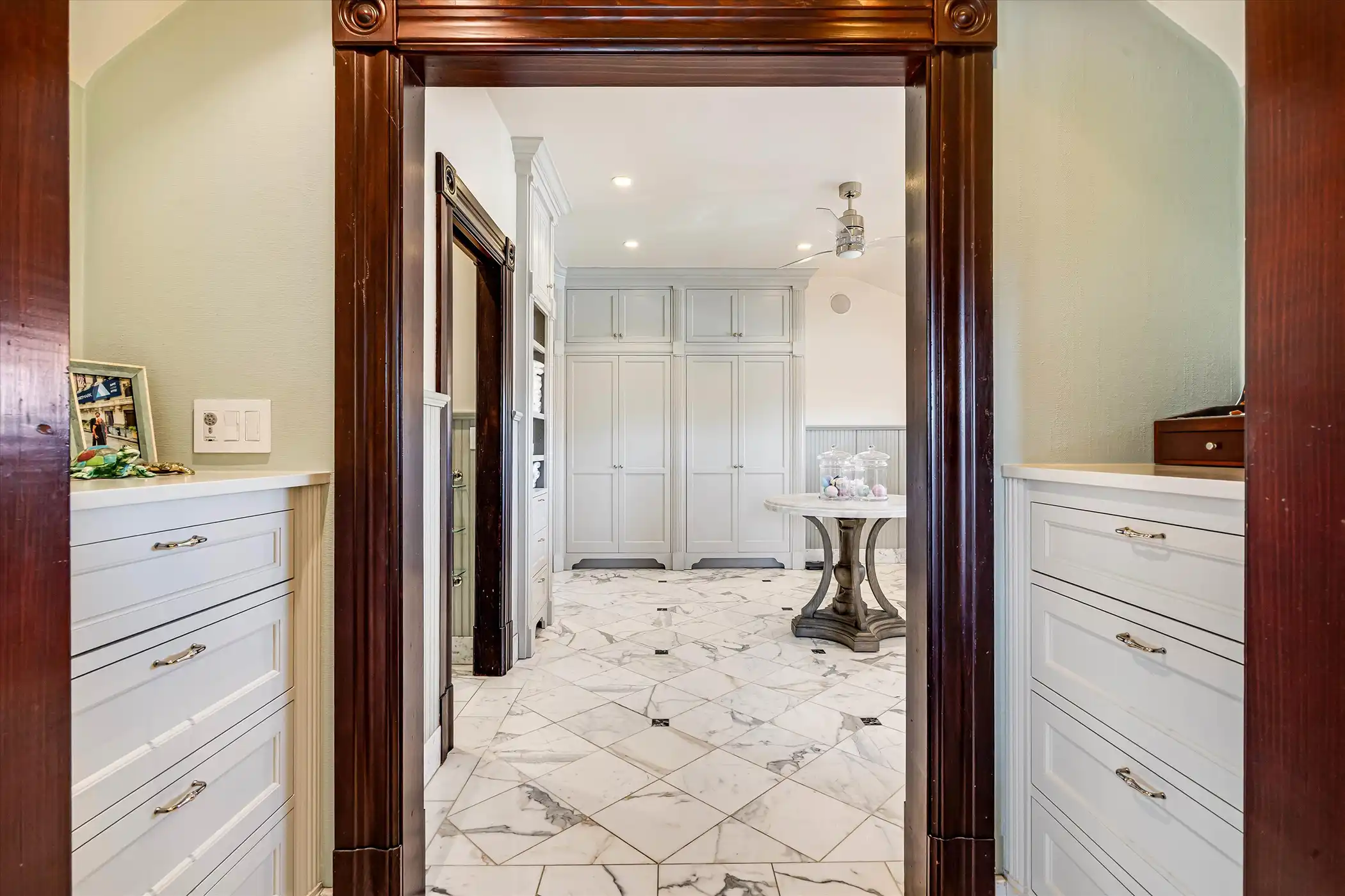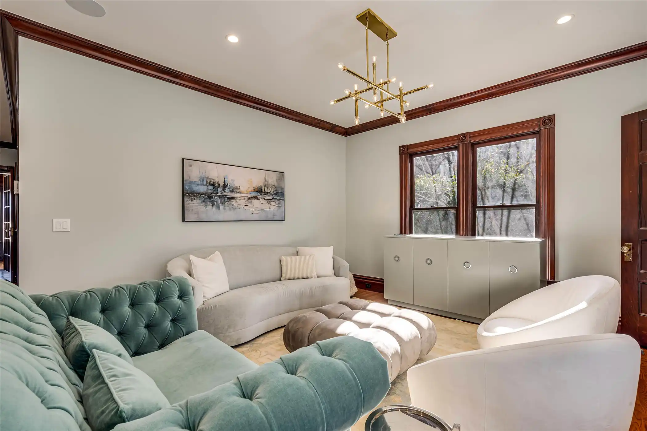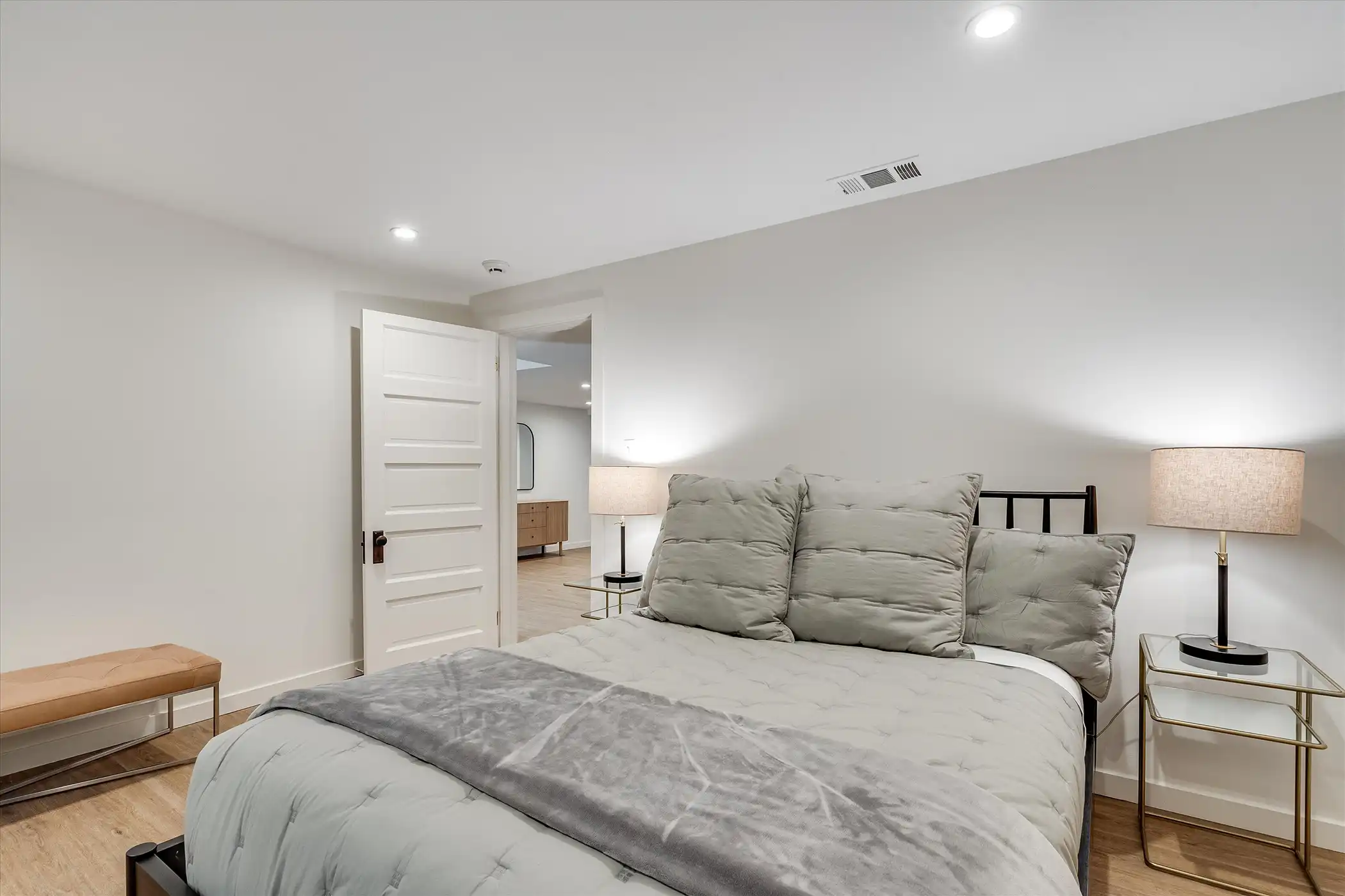 The original restored staircase leads to the upper floor, where the expansive ensuite primary queen bed suite offers a private retreat with an office area, comfortable seating space with a 50” TV, and a separate sitting room with a wet bar. The oversized primary bathroom is distinguished by marble tile floors, a deep soaking tub, and generous closet space. This floor also includes an additional ensuite queen bedroom overlooking the backyard, as well as a washer and dryer.