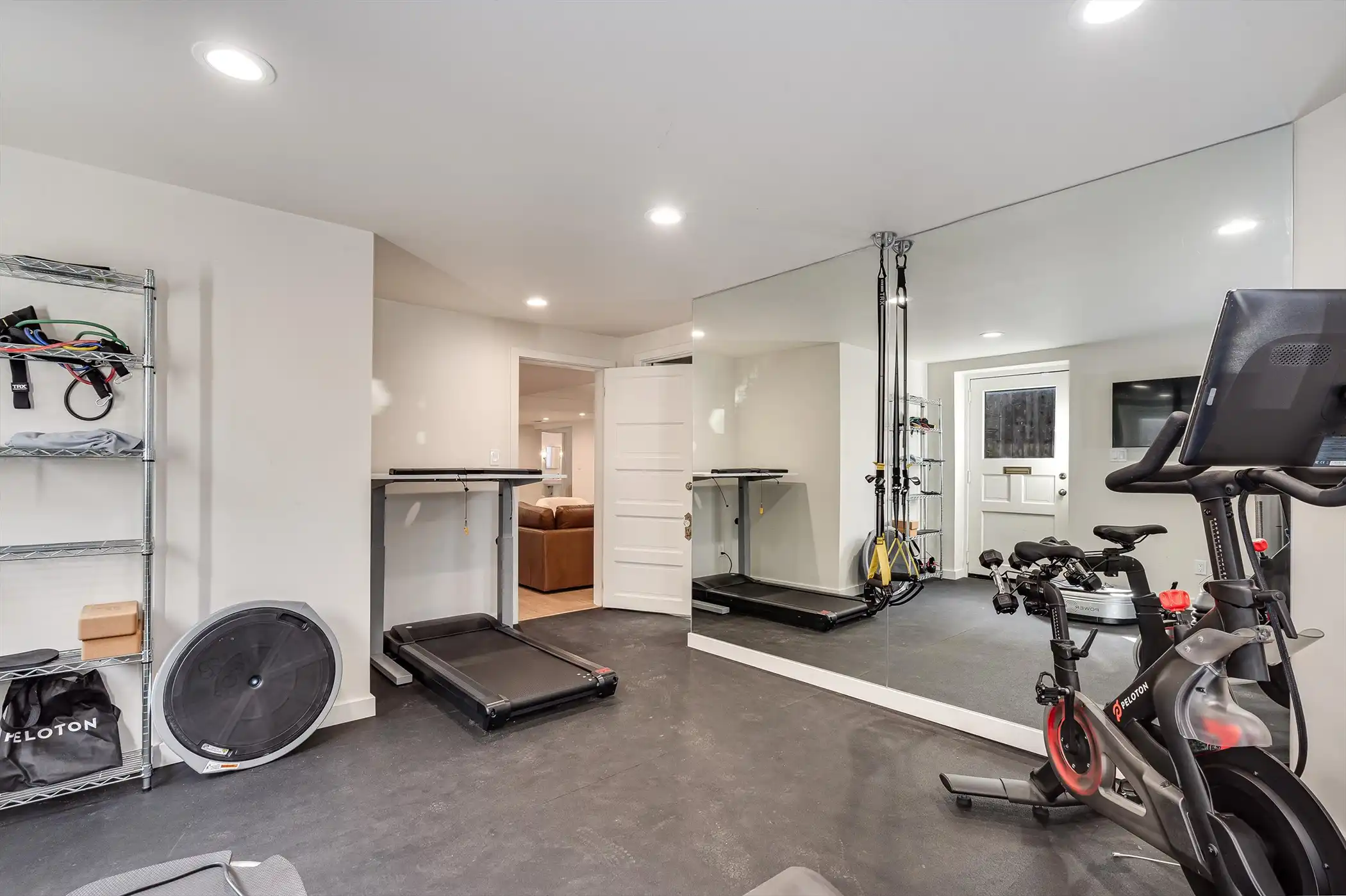 The ground level boasts a private guest apartment with 2 queen bedrooms, 1 bathroom and its own living room with 50´TV, dining area, contemporary kitchen, and washer and dryer—ideal for extended family, guests, or added privacy. This also has a well-equipped fitness room with a Peloton bike, free weights, and additional exercise equipment on the ground level.