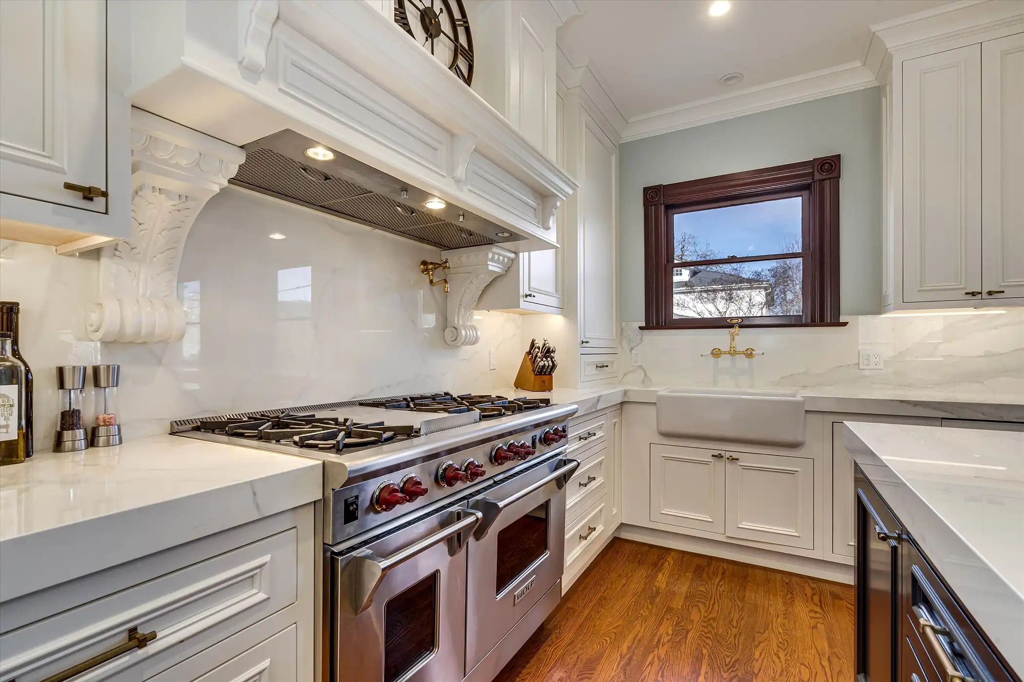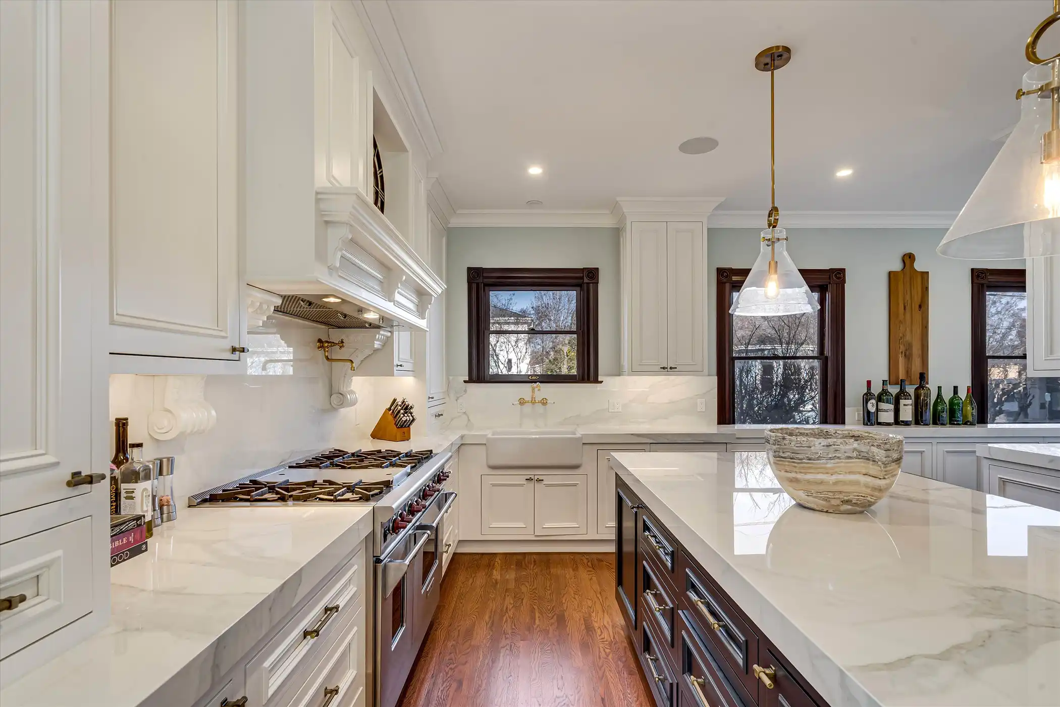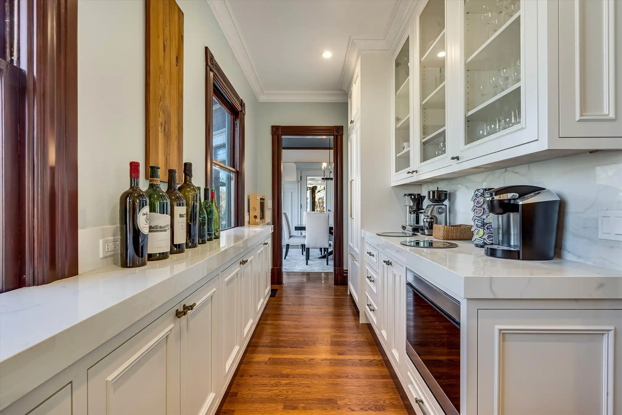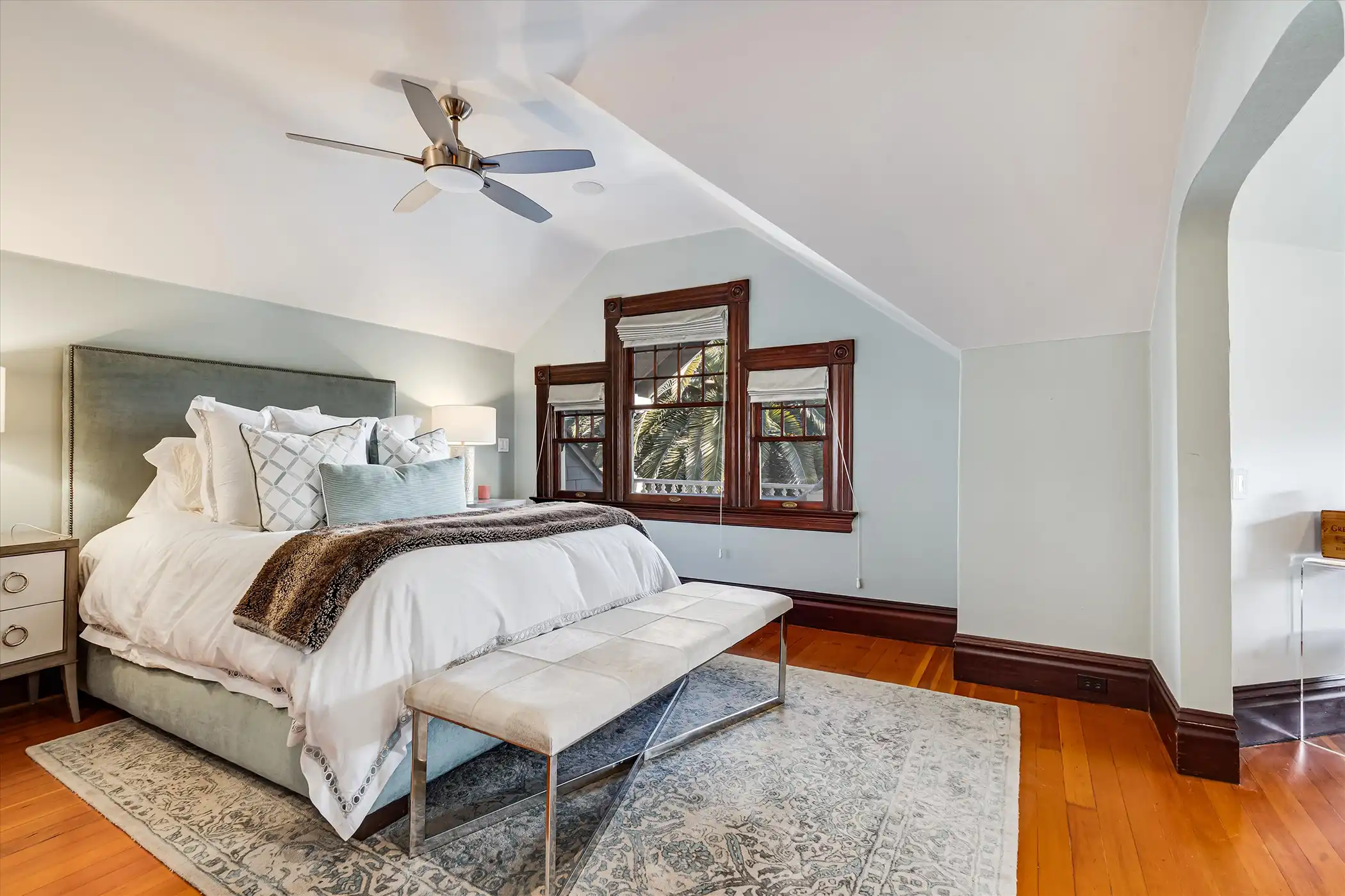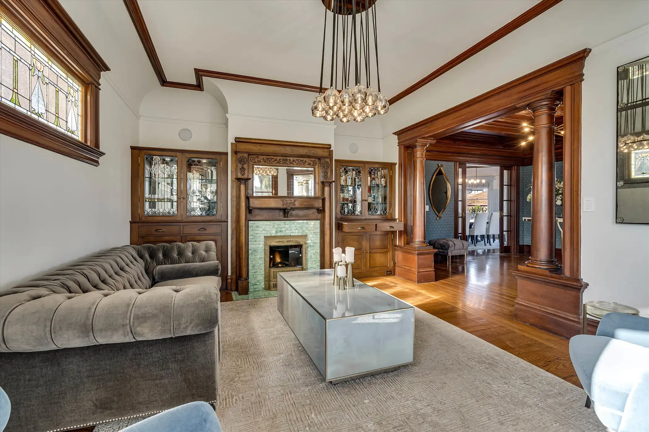 A graceful walkway leads from the sidewalk up to the main level of the home, framed by two majestic palm trees and a partial wraparound porch that sets a welcoming tone. Inside, the main floor showcases original stained glass, restored woodwork, and detailed wood ceilings. This level is anchored by a spacious great room featuring a media area with a 65” TV, a contemporary chef’s kitchen featuring a six-burner Wolf range, two dishwashers, a beverage center and two counter seating areas - one facing the kitchen and another overlooking the backyard patio. A formal dining room seating ten, temperature controlled wine storage, and a separate living room, both with fireplaces, complete the main level, along with a queen bedroom and full bath.