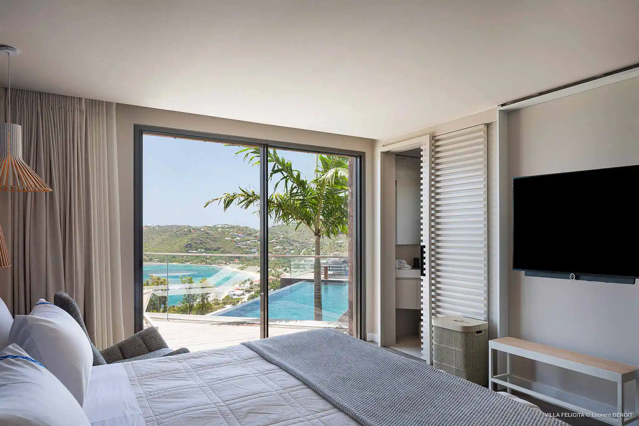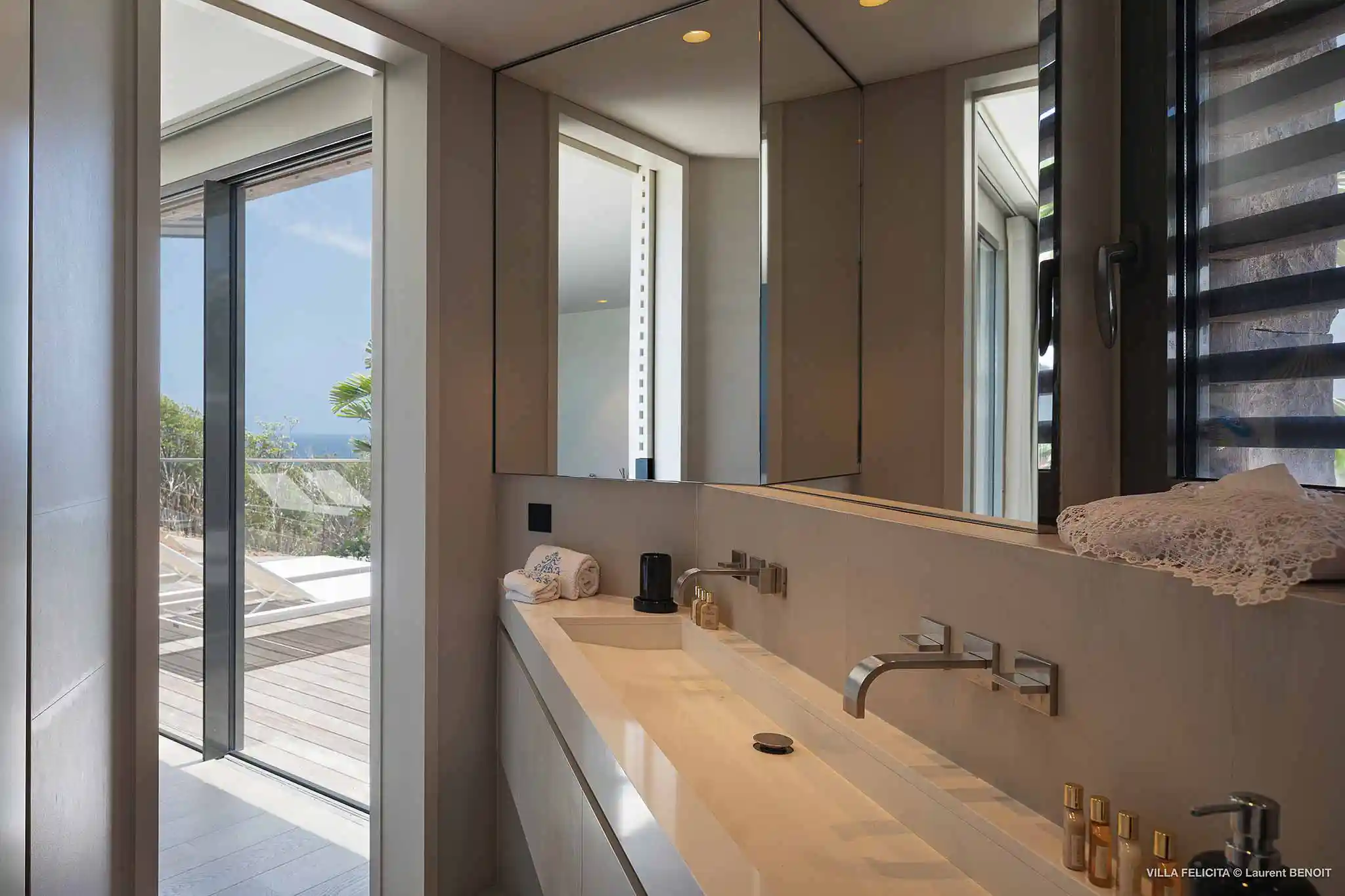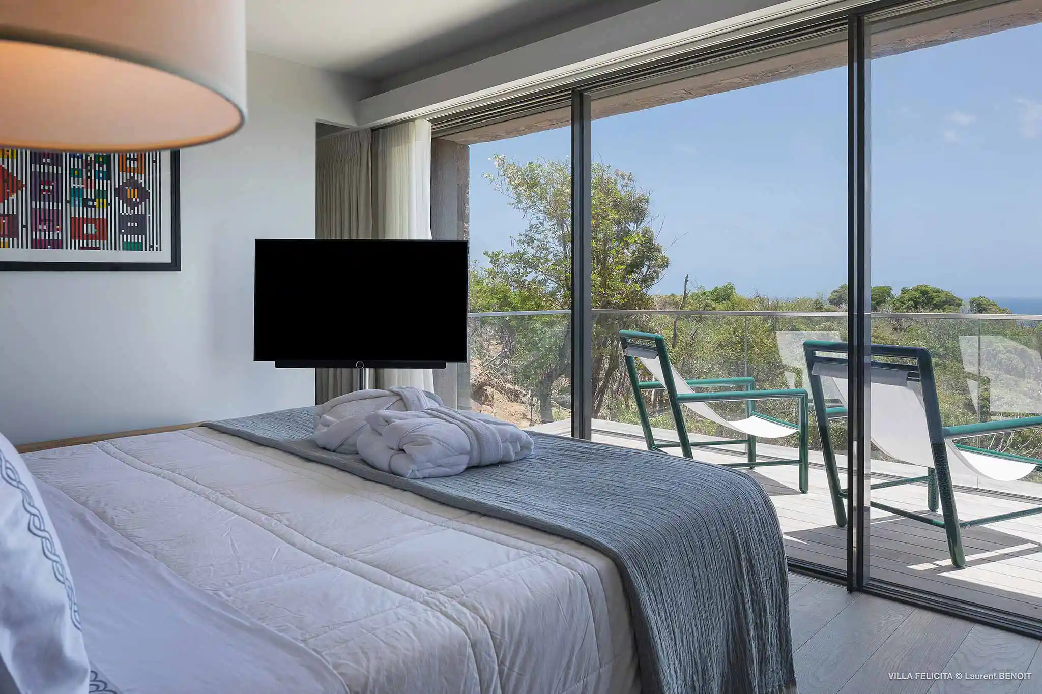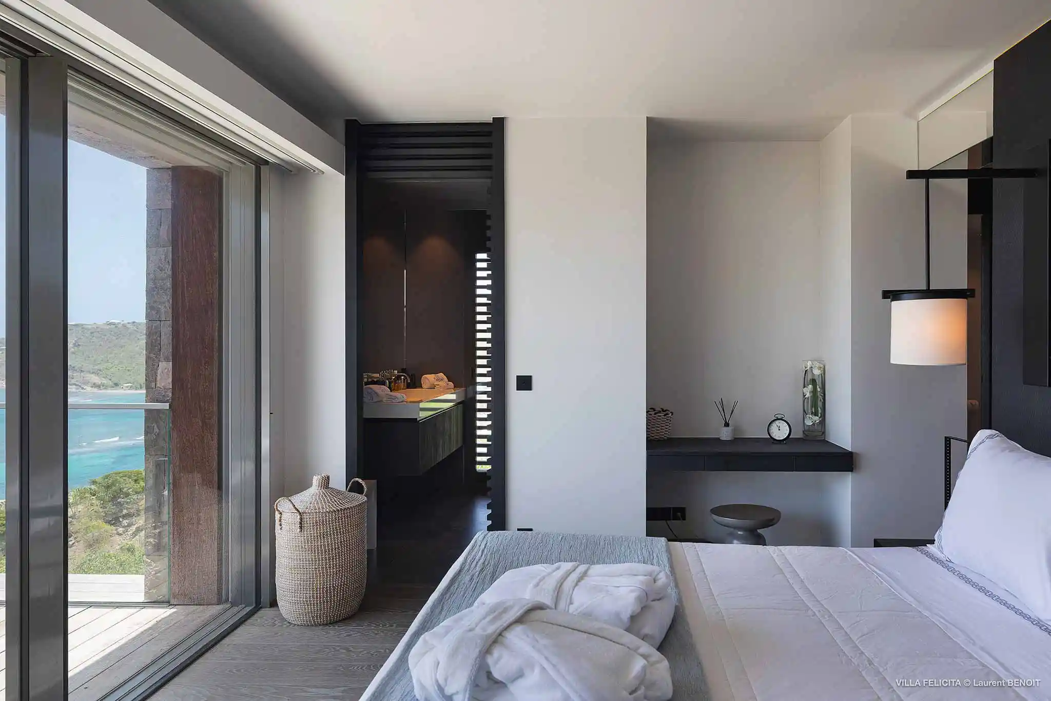 Villa Felicita offers seven air-conditioned bedrooms spread across several buildings and three levels, which is exactly the kind of layout that keeps a group happy. Each bedroom has an ensuite bathroom, and most open to magnificent ocean views; the seventh bedroom is especially handy for staff or a teen who wants a bit of independence.