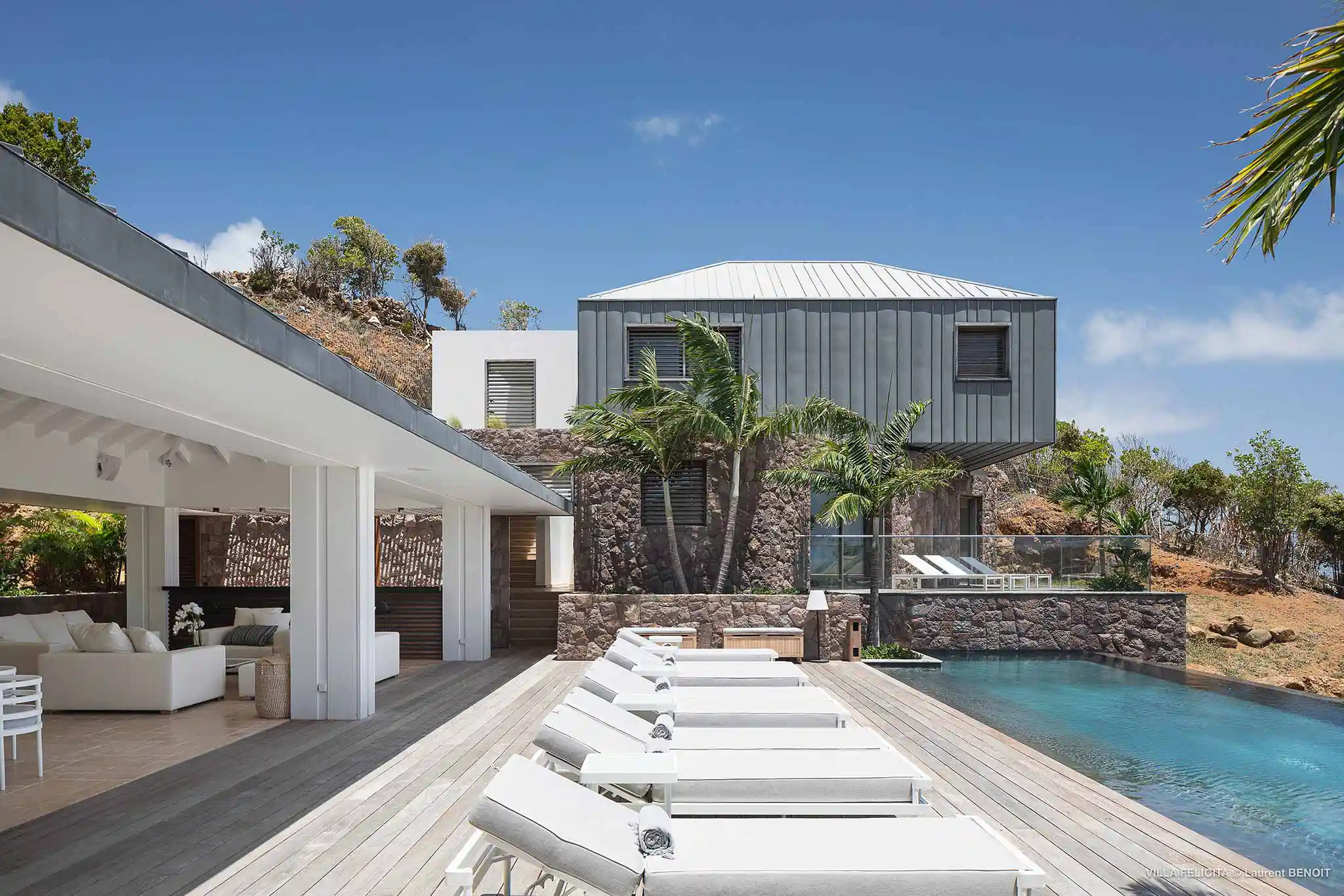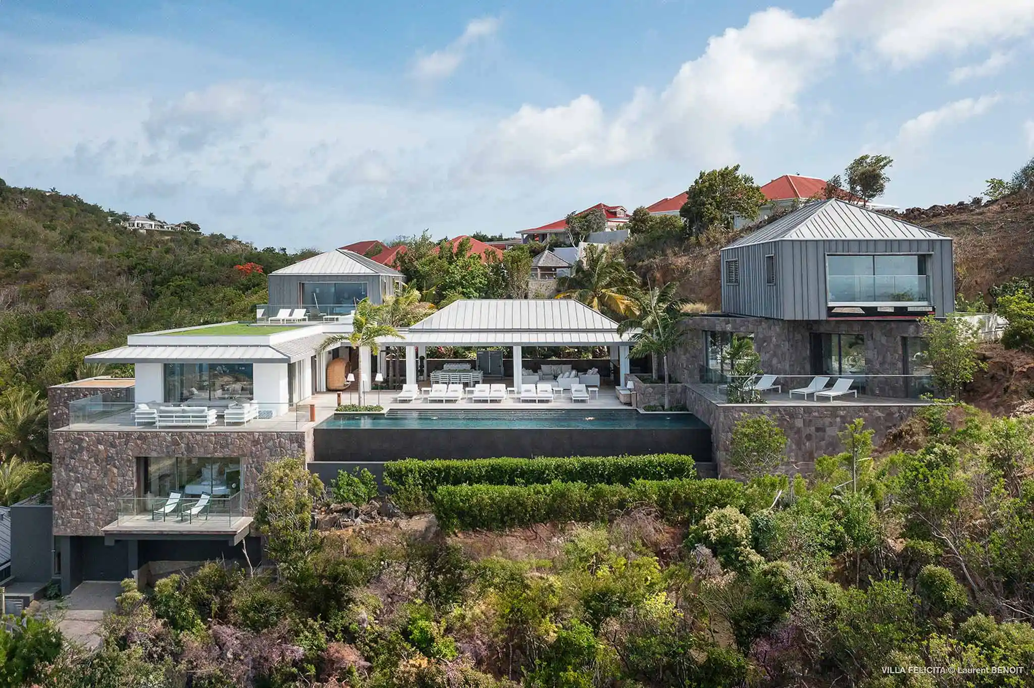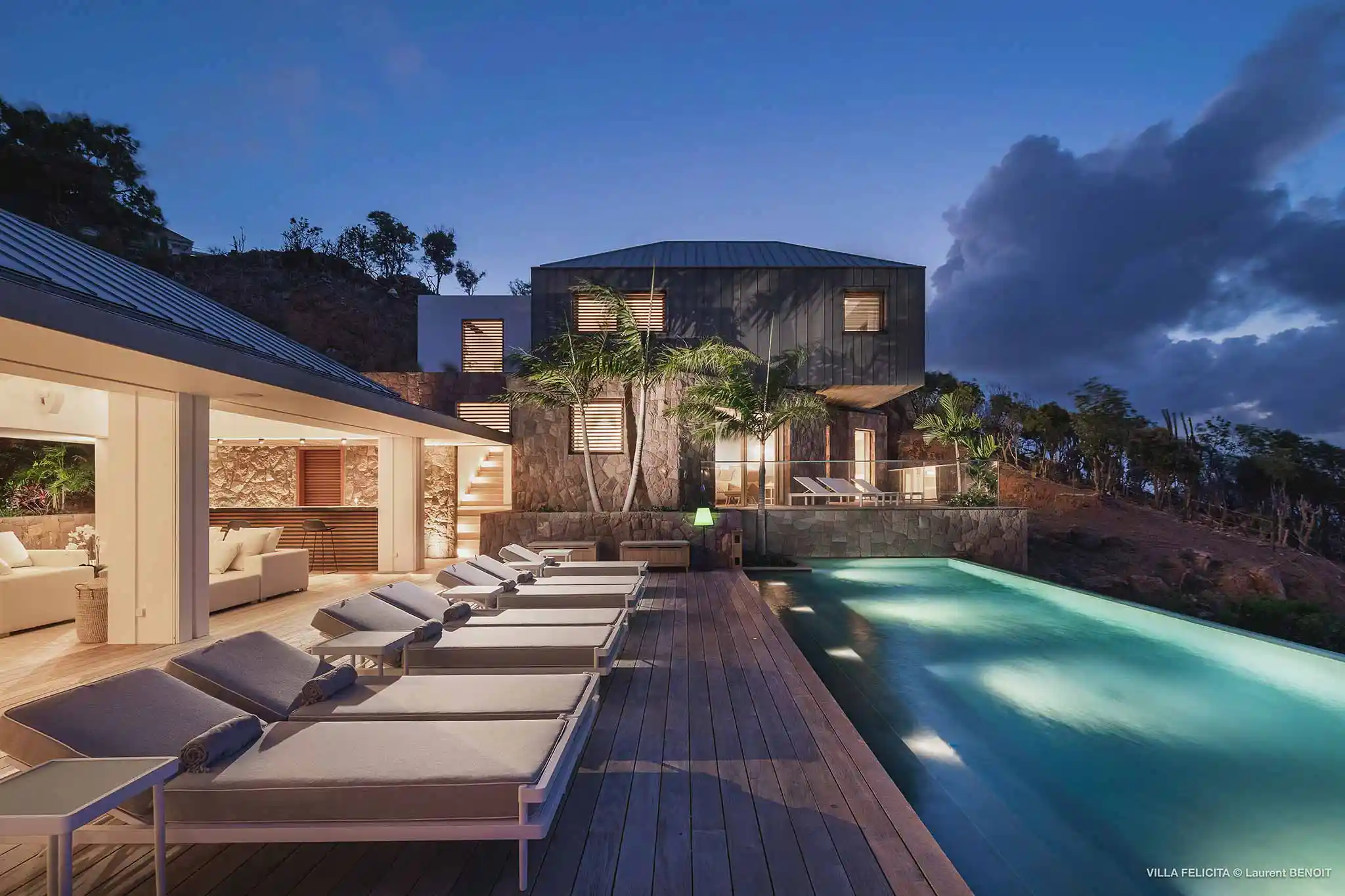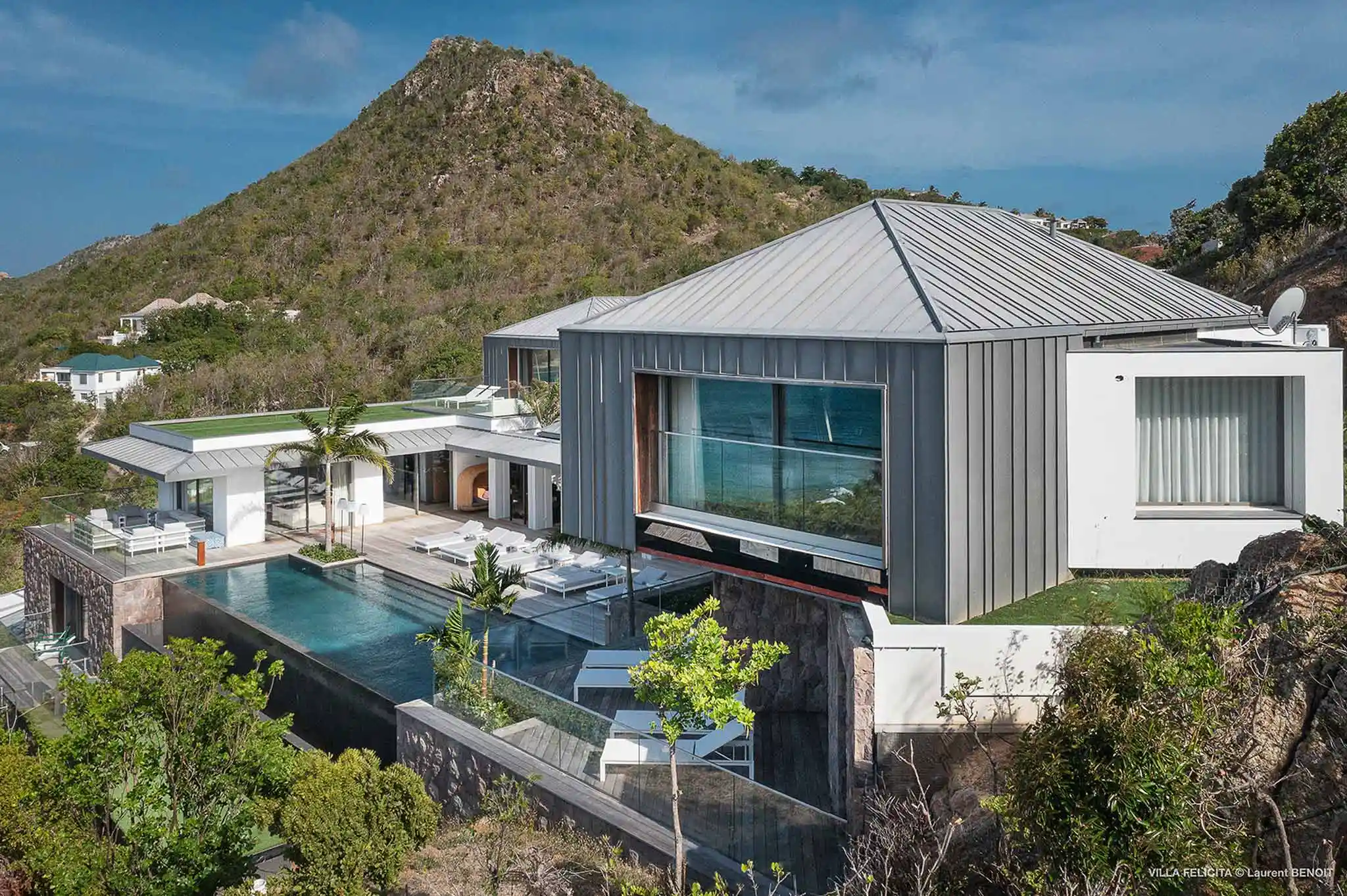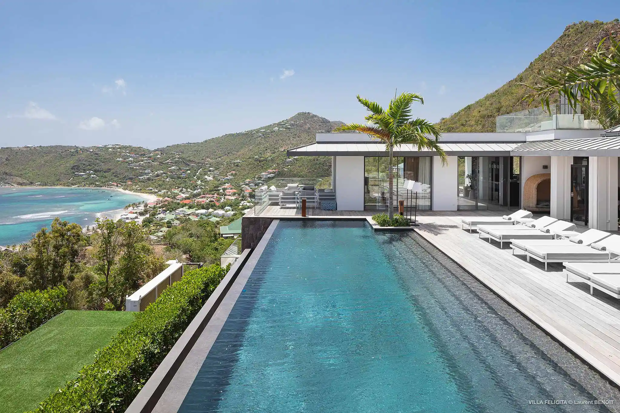 Villa Felicita is a contemporary showpiece in Lorient, designed by Jean-Michel Wilmotte. It features seven suites, a heated infinity pool, and a cinematic sense of style.