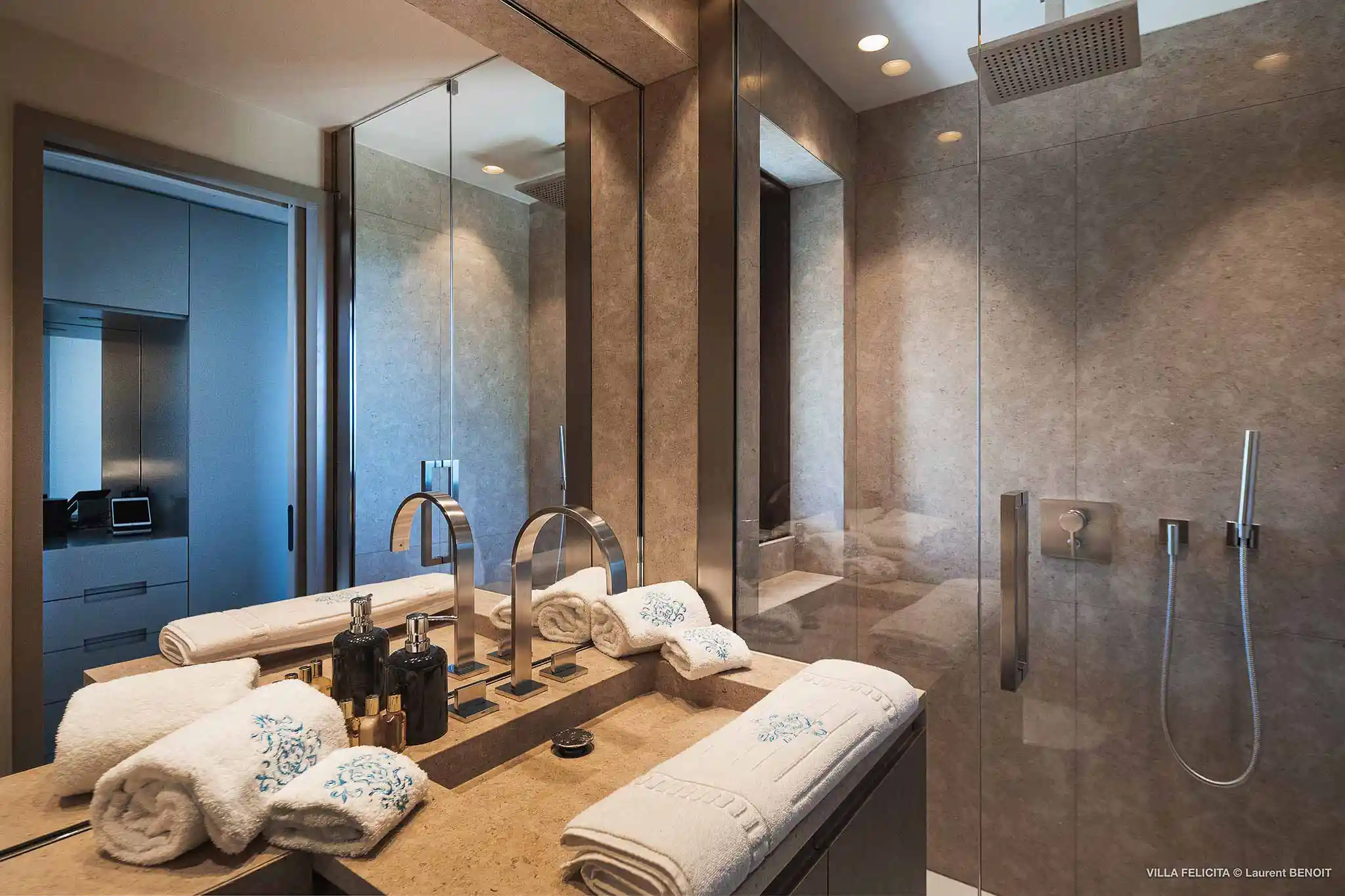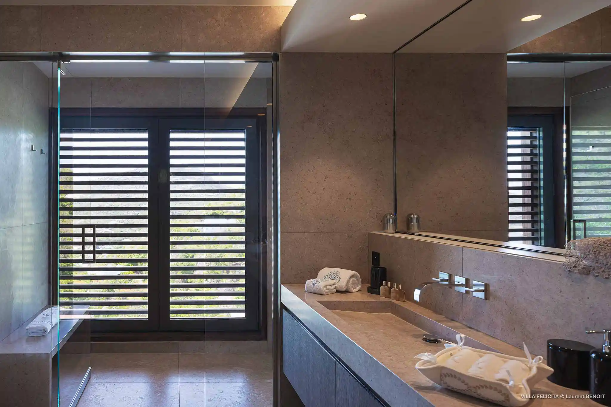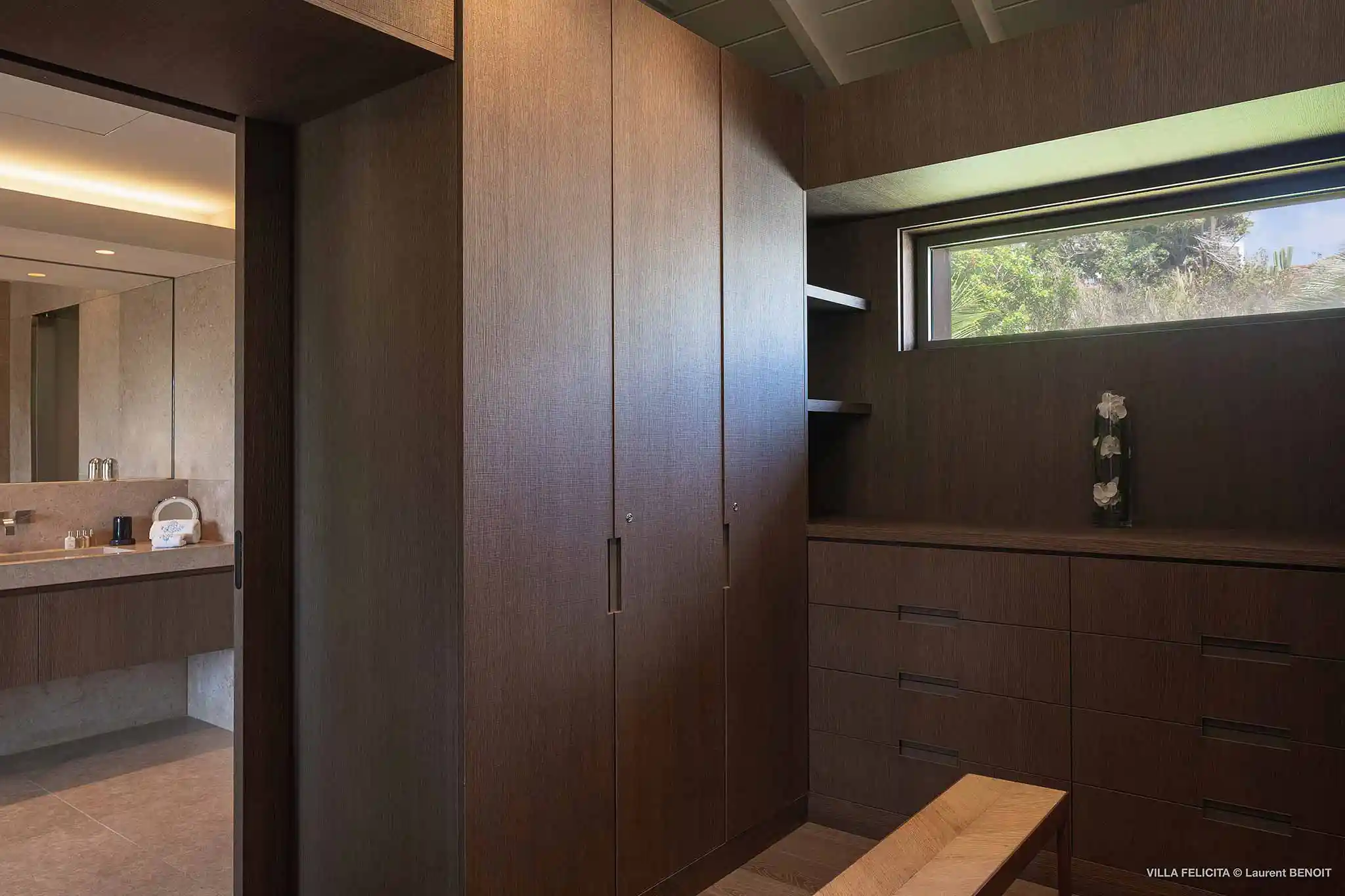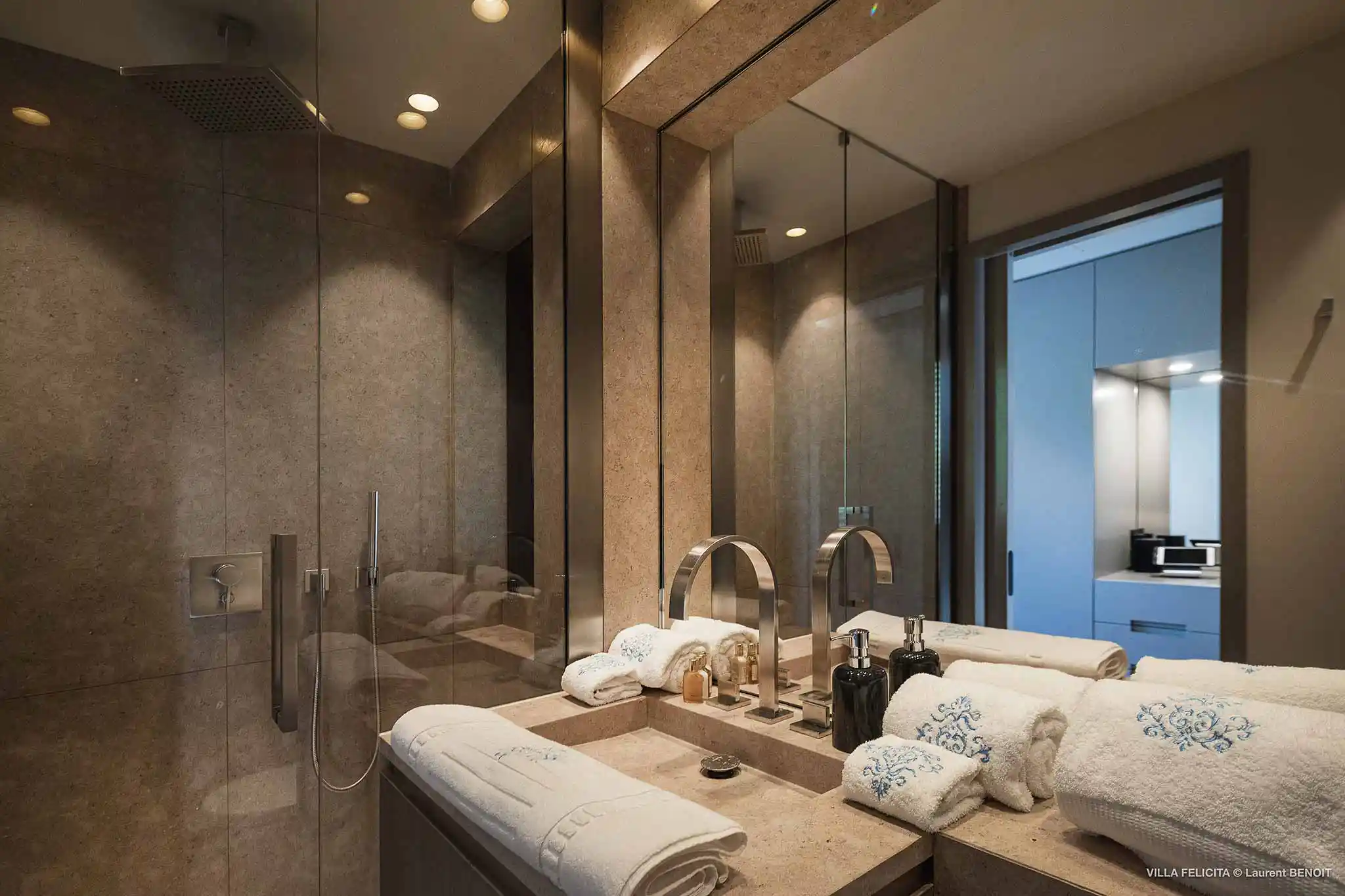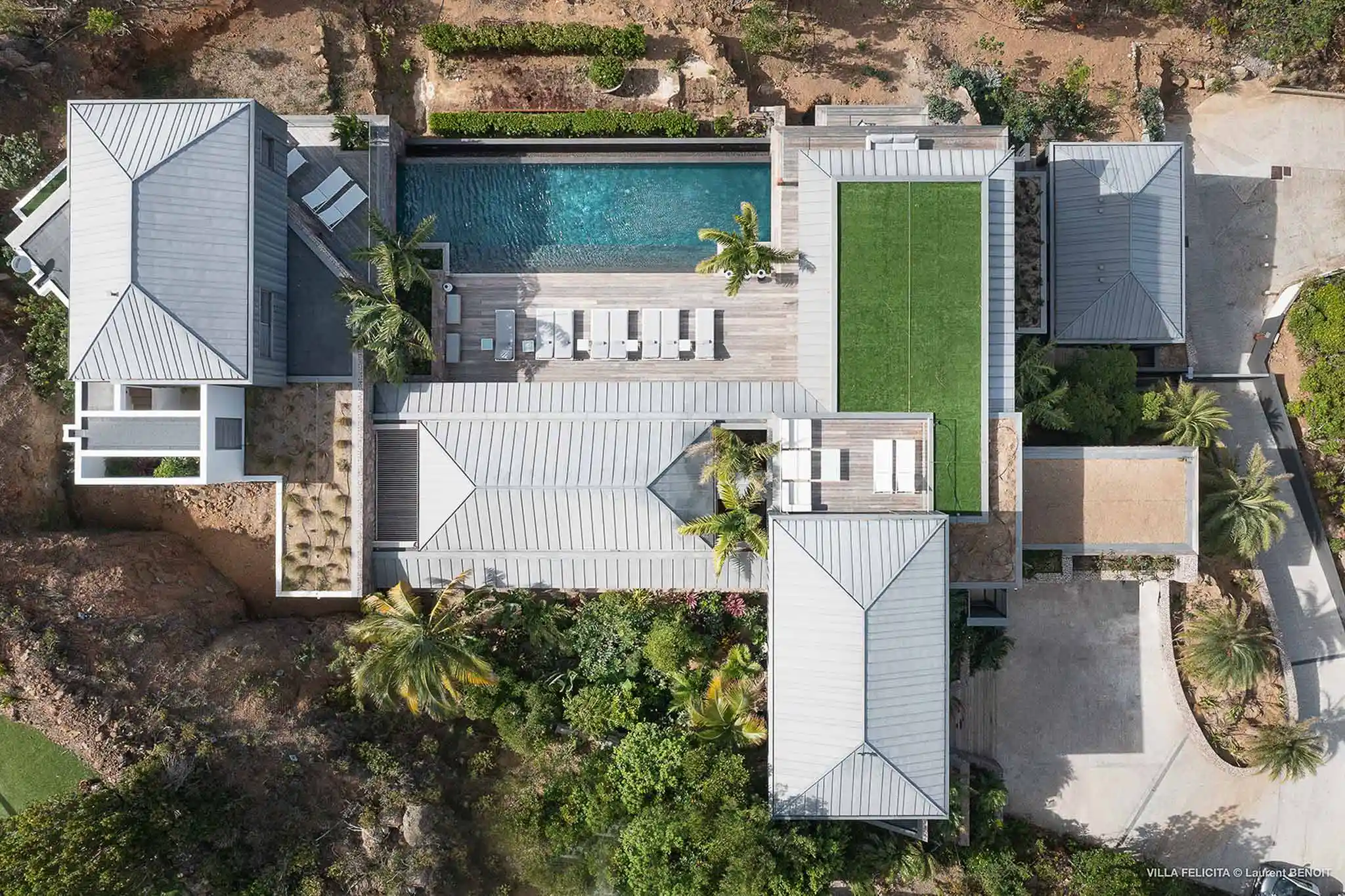 Villa Felicita is a contemporary showpiece in Lorient, designed by Jean-Michel Wilmotte. It features seven suites, a heated infinity pool, and a cinematic sense of style.